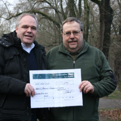Scheckübergabe von Herrn Krönert an den Wildpark Leipzig e.V. (Herr Thomas Krönert, Herr Ralf Herrmann). Die Spende kommt den Tieren zugute.